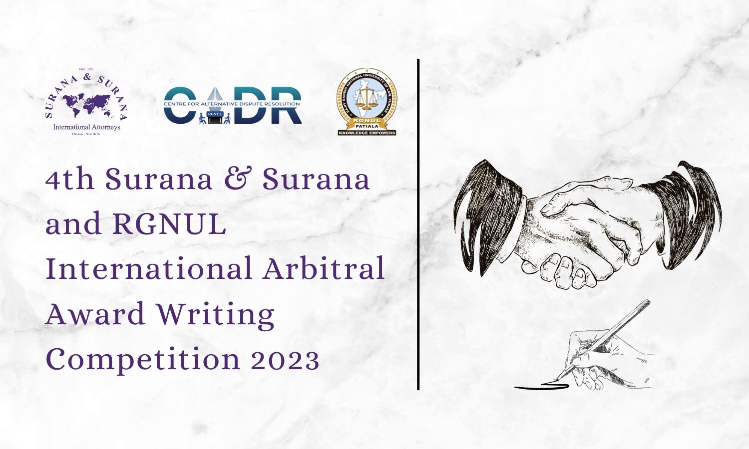 Centre for Alternative Dispute Resolution, RGNUL is organising the 4th Surana & Surana and RGNUL International Arbitral Award Writing Competition, 2023. Scroll for more details!