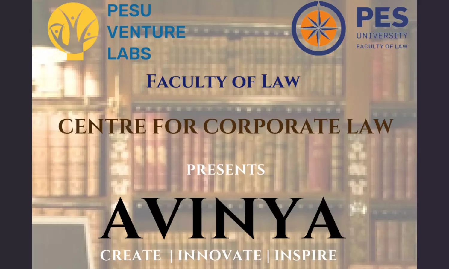 Avinya 2023 is a hybrid mode legal startup competition organized by the Centre for Corporate Law, Faculty of Law, PES University, Bangalore. The competition creates a platform for the students to showcase their entrepreneurial skills by proposing a start-up business that encourages legal innovation and intends in resolving complexities faced by students and legal professionals in the presence of many eminent personalities from the corporate field.