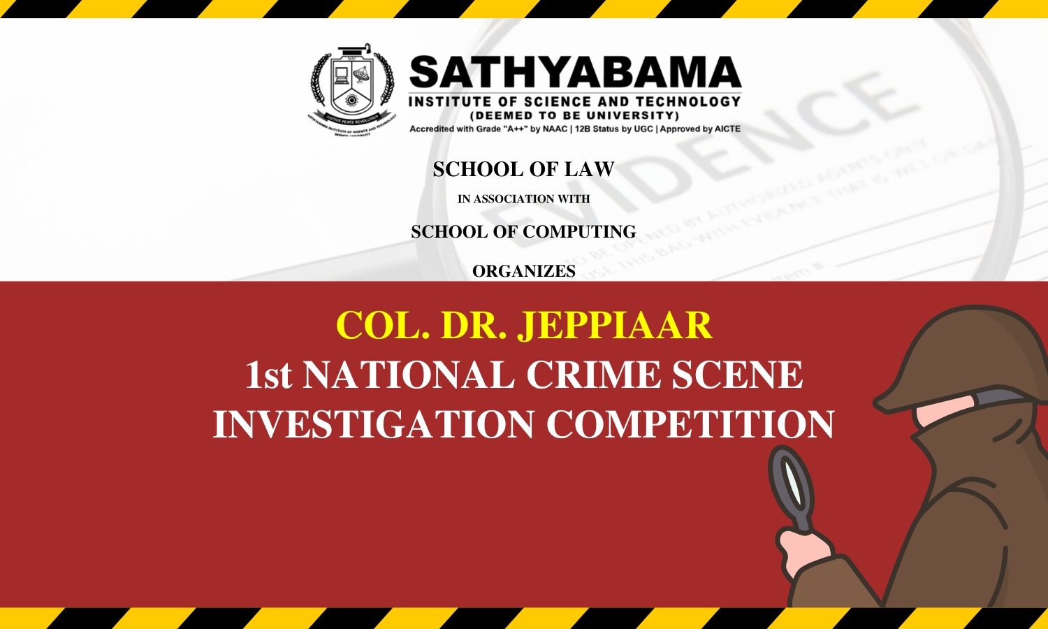 School of Law of Sathyabama Institute of Science and Technology is organizing the Col. Dr. Jeppiaar 1st National Crime Scene Investigation Competition on August 12, 2023.
