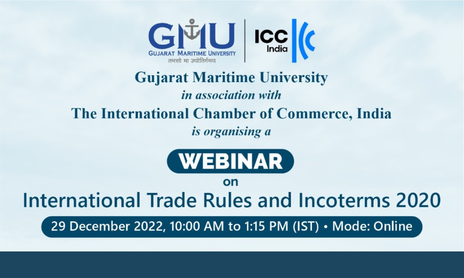 Webinar on International Trade Rules and Incoterms 2020 is being organized by Gujarat Maritime University (GMU) in association with International Chamber of Commerce (ICC) India on 29 December 2022 @10:00 AM (IST).