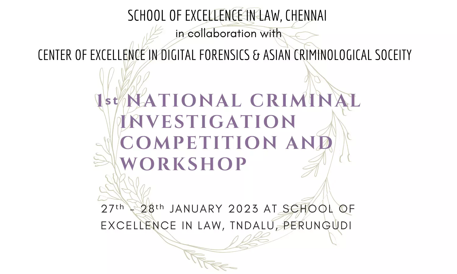1st National Criminal Investigation Competition and Workshop is being organised by School of Excellence in Law, TNDALU from 27th to 28th January, 2023.