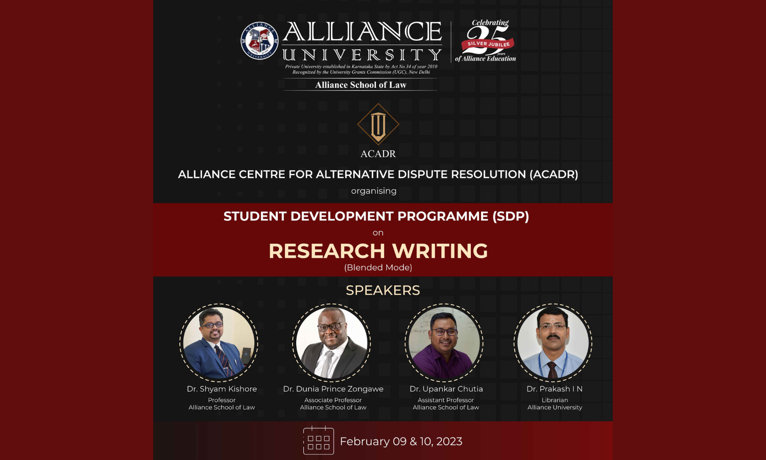 Alliance Centre for Alternative Dispute Resolution (ACADR), Alliance School of Law is organising the ACADR Student Development Programme (SDP) on Research Writing on 09th & 10th February 2023.