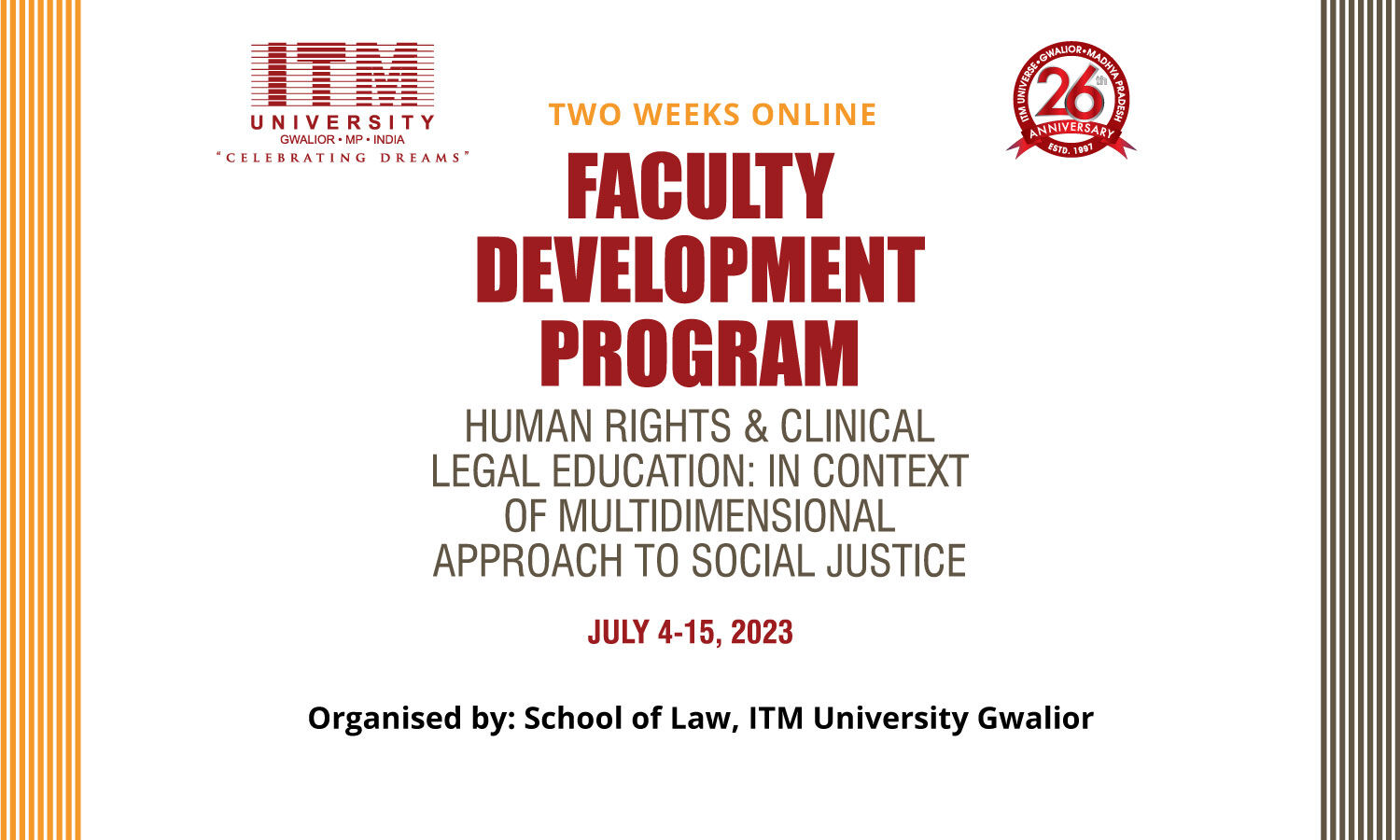 School of Law, ITM University Gwalior is organising two weeks on-line Faculty Development Program on Human Rights and Clinical Legal Education: In Context of Multidimensional Approach to Social Justice from 4th July 2023 to 15th July 2023.