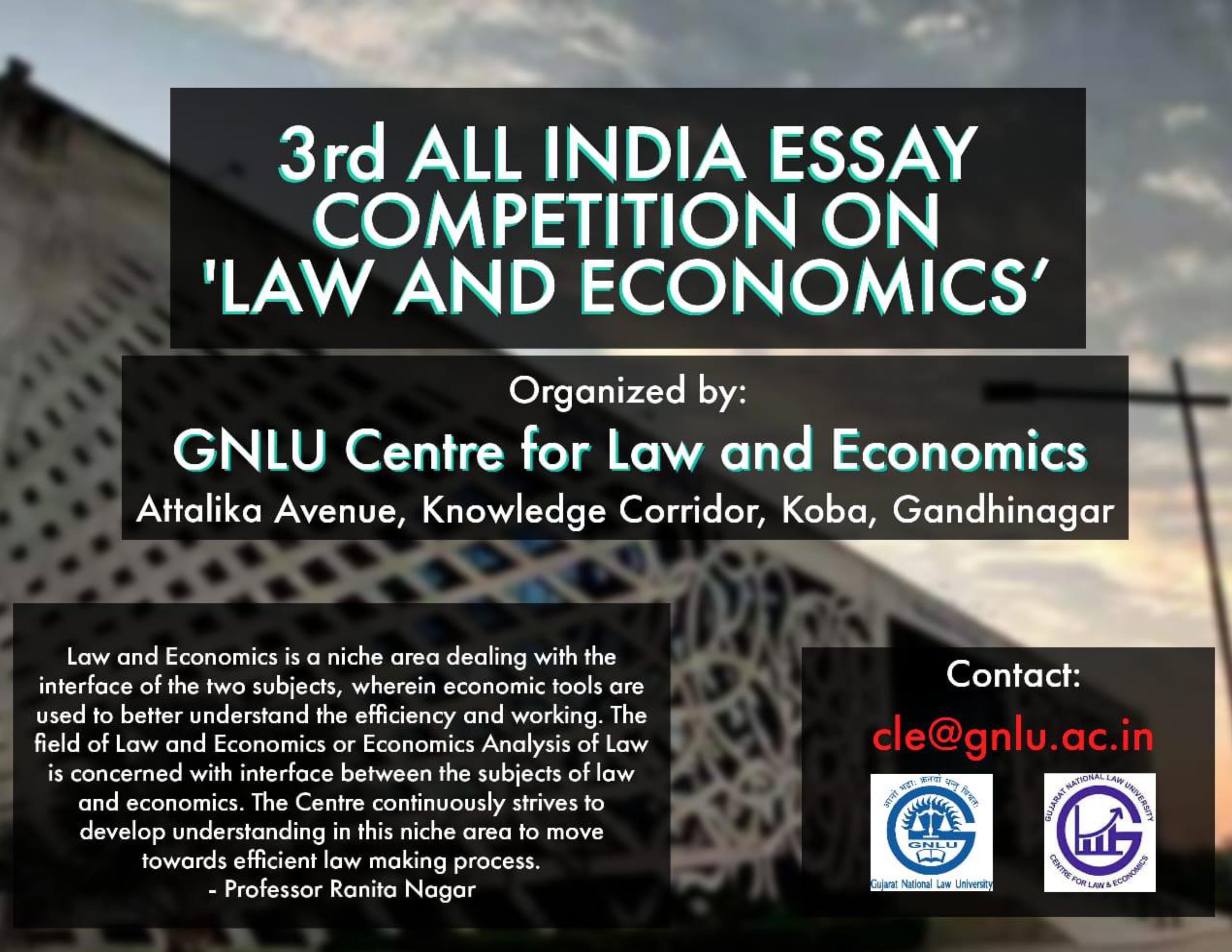 GNLU Centre for Law & Economics (CLE), is organising the 3rd All India Essay Competition on Law and Economics. About the Centre Over the past few decades “Law and Economics” has grown as a niche area dealing with the interface of the two subjects, wherein economic tools are used to better understand the efficiency and working of Law. “The GNLU Centre for Law and Economics continuously strives to develop understanding in this niche area to move towards the efficient...