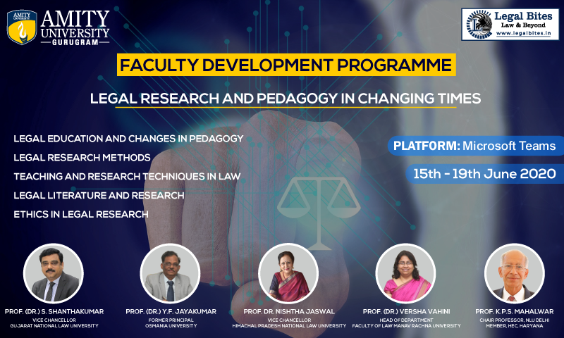 Faculty Development Program: FDP on Legal Research and Pedagogy in Changing Times is being organised by Amity Law School Gurugram and Legal Bites. This 5-day event will be hosted online from 15th – 19th June 2020.