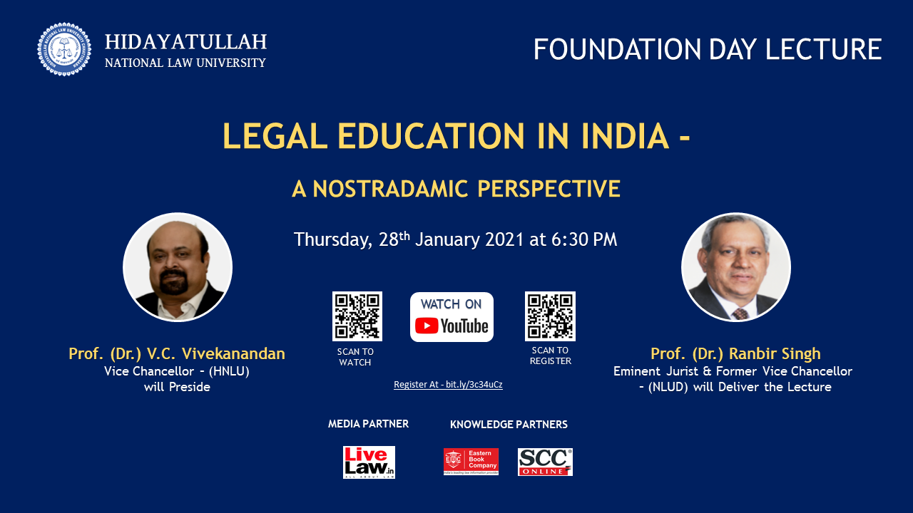 The Hidayatullah National Law University will be celebrating its foundation day on Thursday 28th January 2021. The Foundation Day Lecture will be delivered by Eminent Jurist and Former Vice-Chancellor of National Law University, New Delhi on the theme – “Indian Legal Education- A Nostradamic Perspective” by WebEx Platform and also will be live telecast in HNLU YouTube Channel.