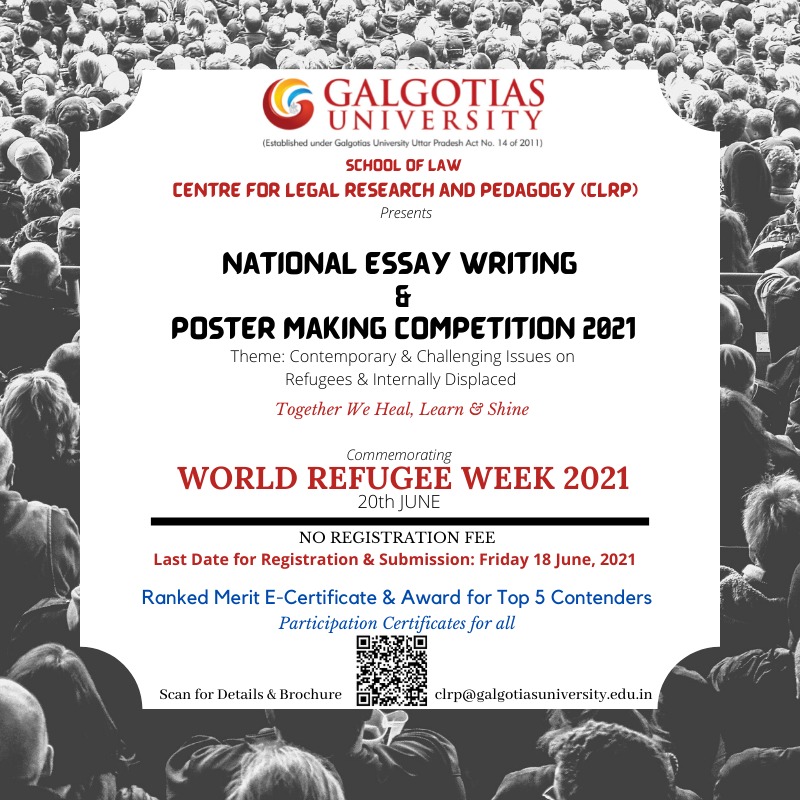 Centre for Legal Research and Pedagogy (CLRP), Galgotias University in pursuance of its objective is conducting a National Essay Writing & Poster Making Competition 2021. CLRP aims to facilitate and encourage research in the field of Refugees.