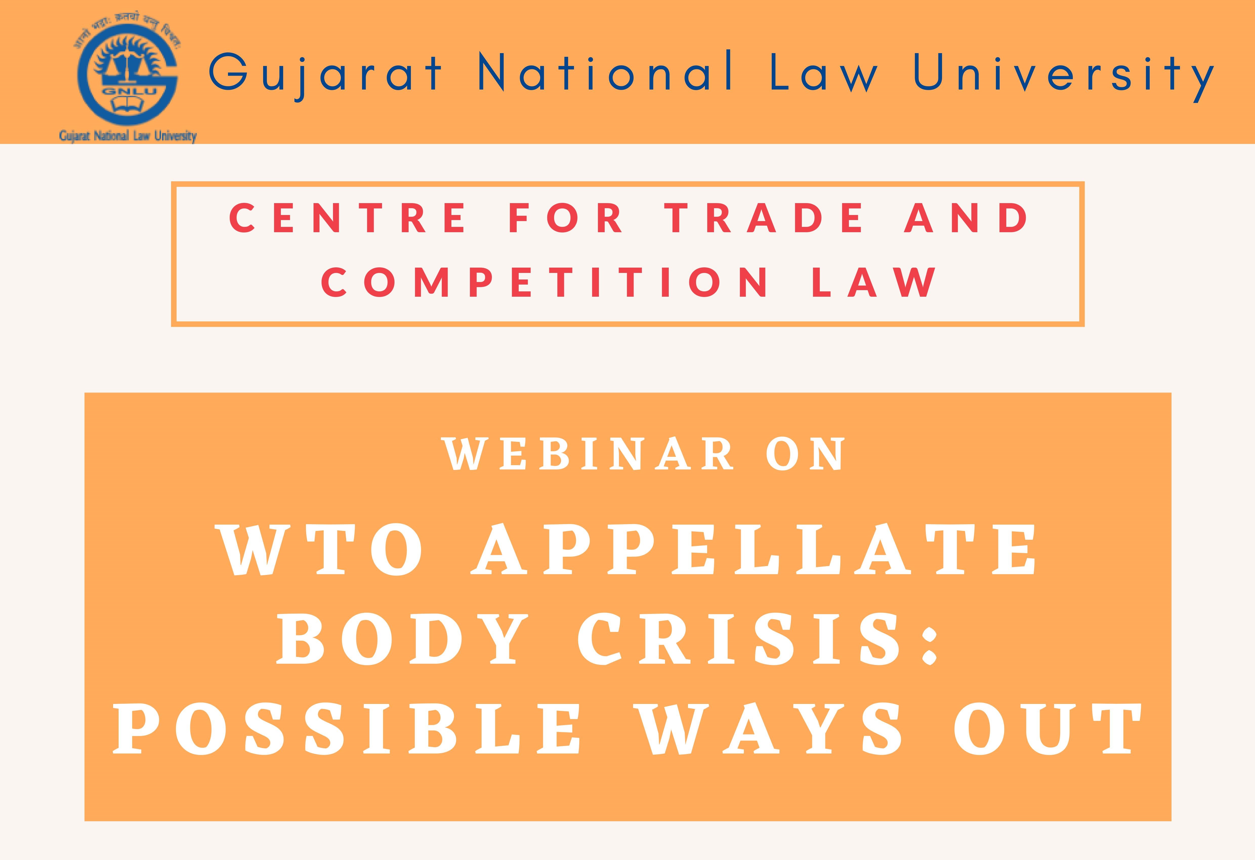 Centre for Trade and Competition Law, Gujarat National Law University is delighted to announce a Webinar on the theme “WTO Appellate Body Crisis and Possible Ways Out” on Friday, 9th October 2020 at 5 PM.