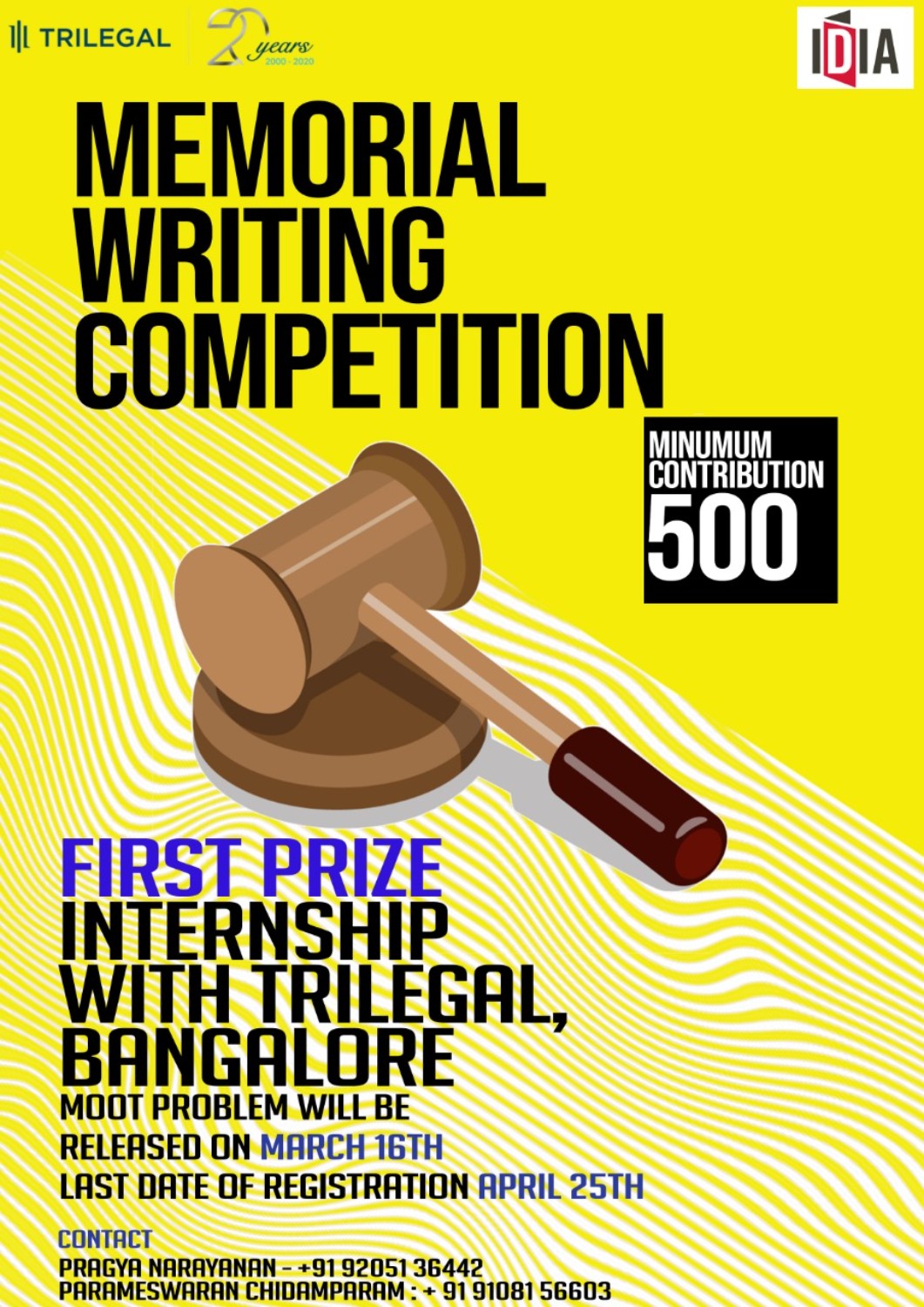 IDIA Kerala Chapter is organising 1st Edition of National Memorial Writing Competition. Register by April 25. The winner gets an opportunity to intern with Trilegal, Bangalore.