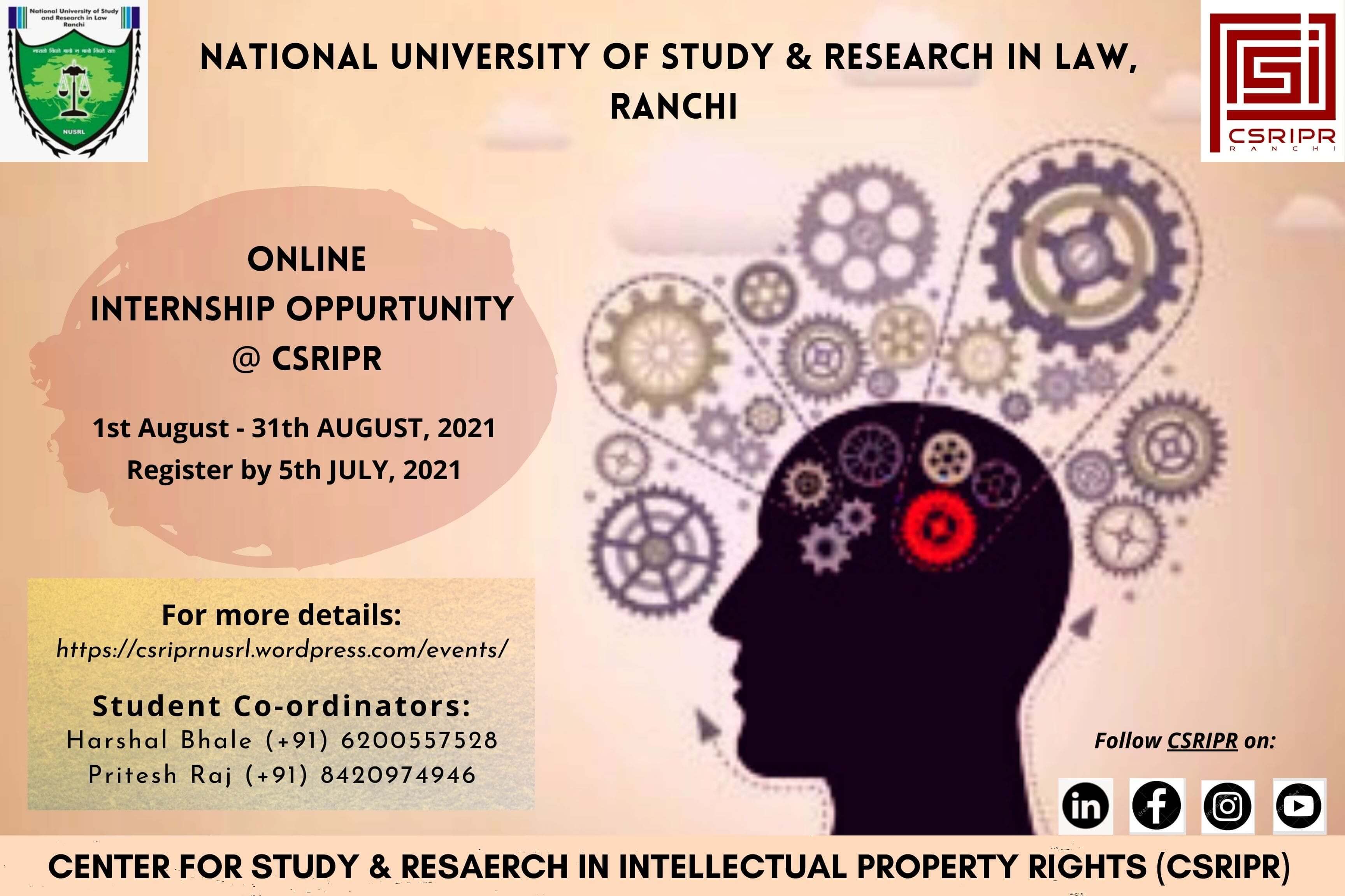 CSRIPR, National University of Study and Research in Law (NUSRL) invites application for internship for August 2021 (4 Weeks), Apply by July 5.