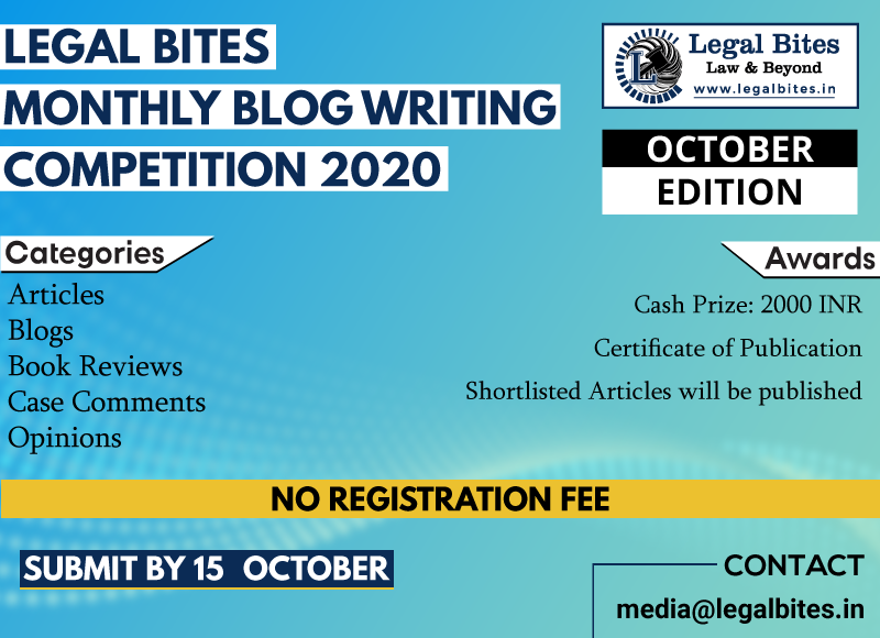 Legal Bites is proud to announce the October Edition of its Blog Writing Competition 2020. This competition aims to provide ample opportunities to the students, academicians, and other people where they can express their thoughts, hone their talent, and be a part of this competition and upgrade their respective knowledge and writing skills.