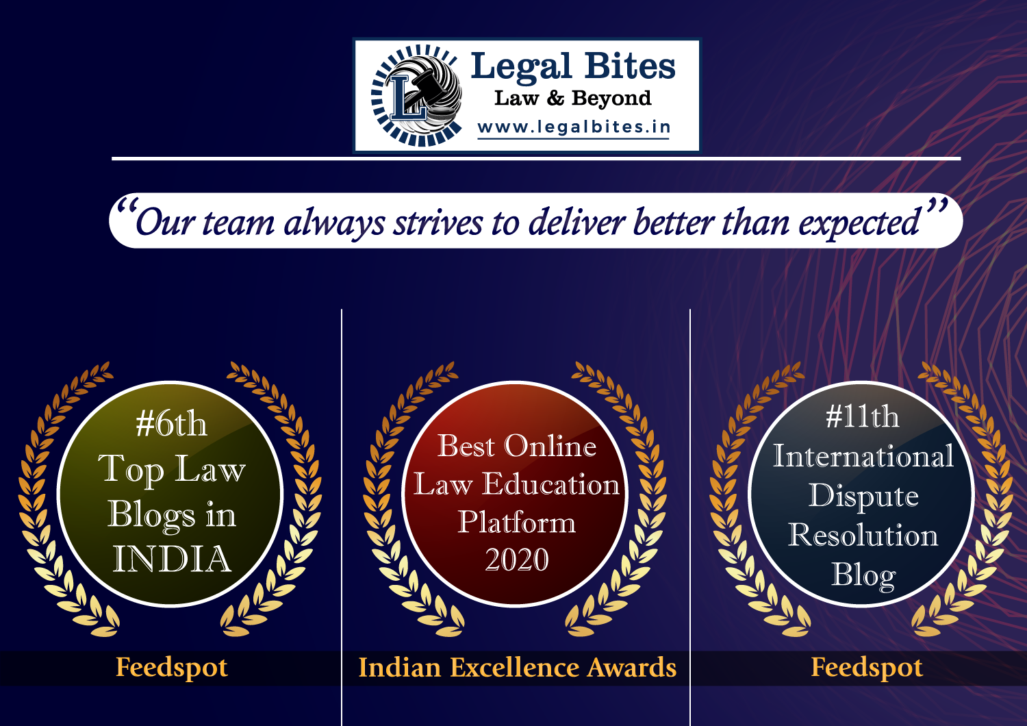 Legal Bites has been recognised as the ‘Best Online Law Education Platform 2020’ in Indian Excellence Awards by APAC insider. With countless efforts and positive work ethics, it has also managed to rank 6th among top 60 Indian Law Blogs by Feedspot.