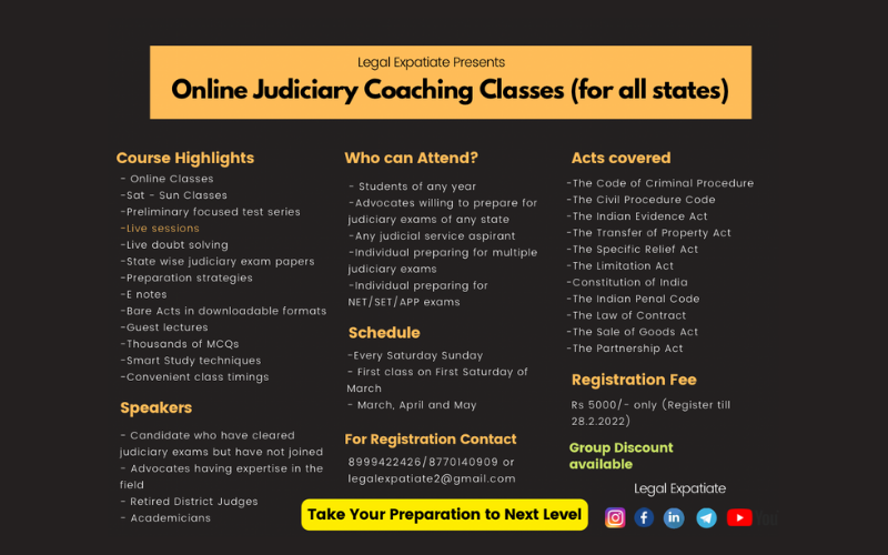 ![Legal Expatiate Online Judiciary Exams Coaching (for all states) Saturday-Sunday Classes (March to May)[Register by 28.2.2022] Legal Expatiate Online Judiciary Exams Coaching (for all states) Saturday-Sunday Classes (March to May)[Register by 28.2.2022]](https://www.legalbites.in/wp-content/uploads/2022/02/Legal-Expatiate-Online-Judiciary-Exams.png)