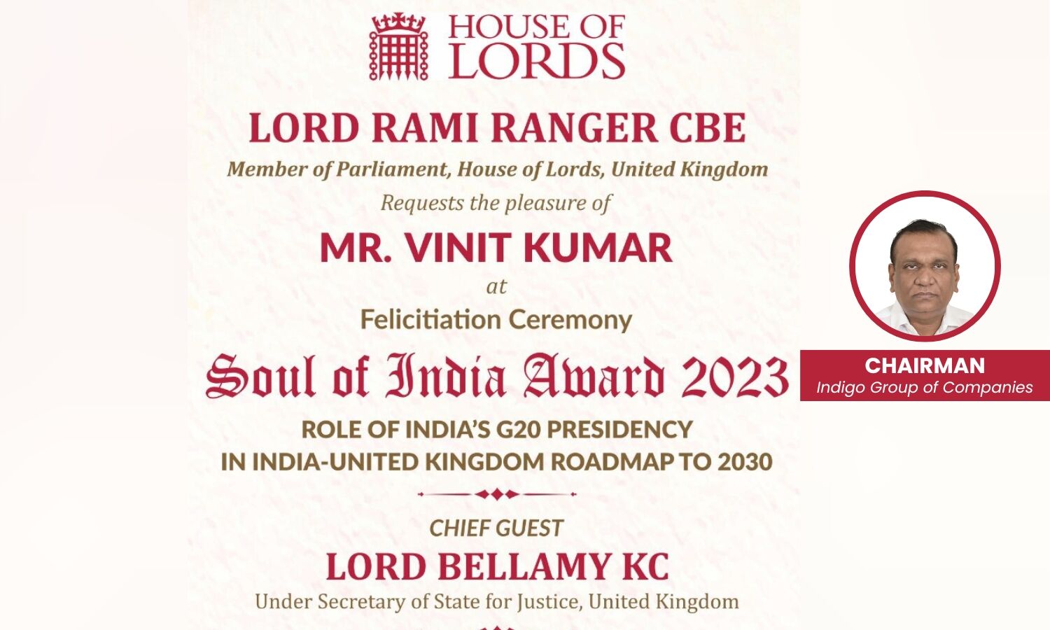 London, UK - In a momentous celebration of their exceptional contributions to nation-building, Mr. Vinit Kumar, Chairman, Indigo Group honoured with the esteemed Soul of India Award 2023 in recognition of the Role of India in G20's Presidency in India-United Kingdom Roadmap to 2030 on June 09 2023. The award ceremony will take place at the House of Lords, Parliament of the United Kingdom, in London, where Lord Rami Ranger CBE, a Member of Parliament in the House of Lords, will be presenting the award. Reportedly the Minister of Law and Justice of India, Arjun Ram Meghwal will also take part in this event.