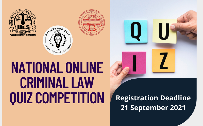 National online criminal law quiz competition is being organized by the Quiz Department of UILS, Punjab University. The Society for Quiz is a constituent society of the University Institute of Legal Studies, Punjab University, Chandigarh. The Society owes its existence to the vital role played by the quizzes in the learning process.