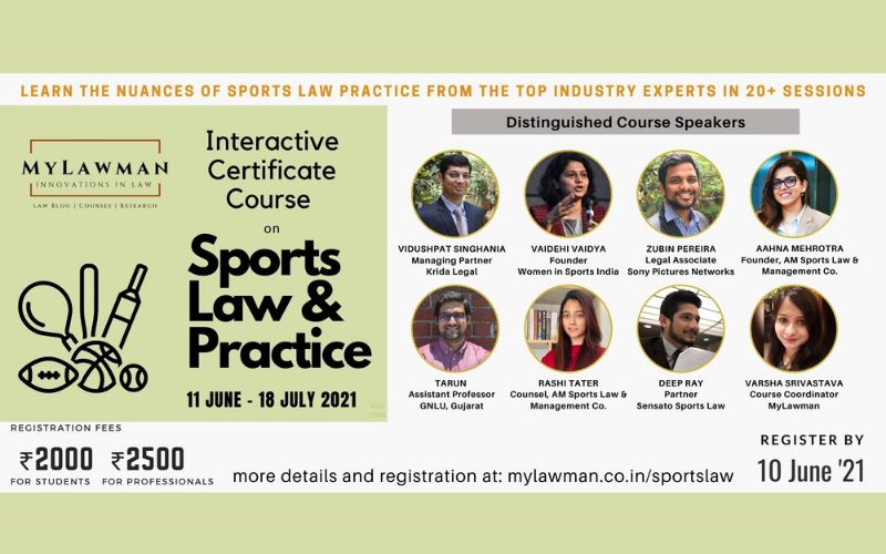 MyLawman is delighted to announce the launch of the Interactive Certificate Course on Sports Law and Practice (ICC-SLP). The certificate course on sports law and practice has been designed for all sports law enthusiasts. With a faculty made up of the recognized professionals in the world of sports and gaming, this course provides the knowledge and skills necessary to become an excellent sports and gaming lawyer, with solid legal foundations and a broader vision of the sector. The course shall be conducted live in online mode from 11th June 2021 to 18th July 2021 on weekends (Fri, Sat & Sun) in the evening batches (4:00 PM- 5:00 PM).