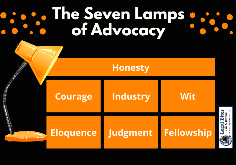 The seven lamps of Advocacy[6] an admirable book written by Judge Abbot Parry refers to the essential qualities that must be possessed by an advocate for success in his legal profession and the bar.