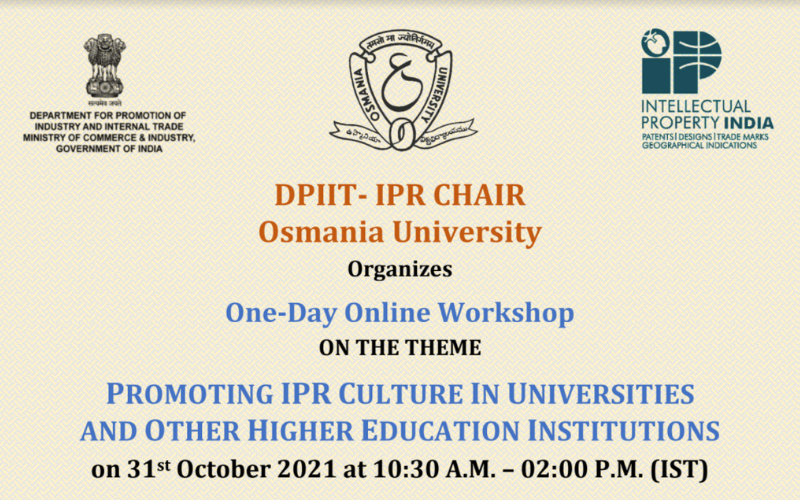 The DPIIT-IPR Chair at Osmania University is organizing a One-Day Online Workshop on ‘Promoting IPR Culture in Universities and other Higher Education Institutions’.