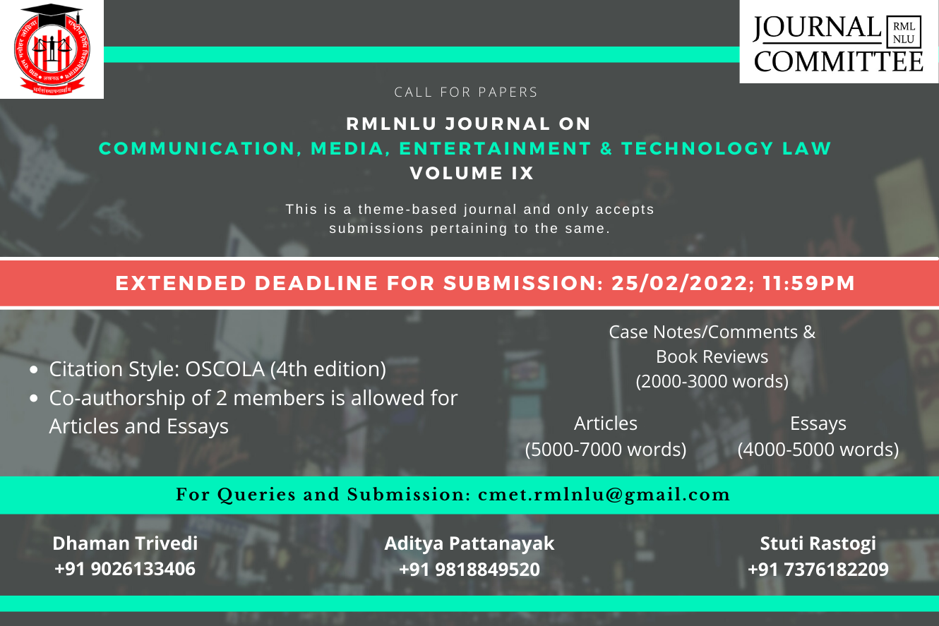 Call for Papers: RMLNLU Journal on Communication, Media, Entertainment & Technology Law [Vol. 9]: Submit by 25th Feb 2022