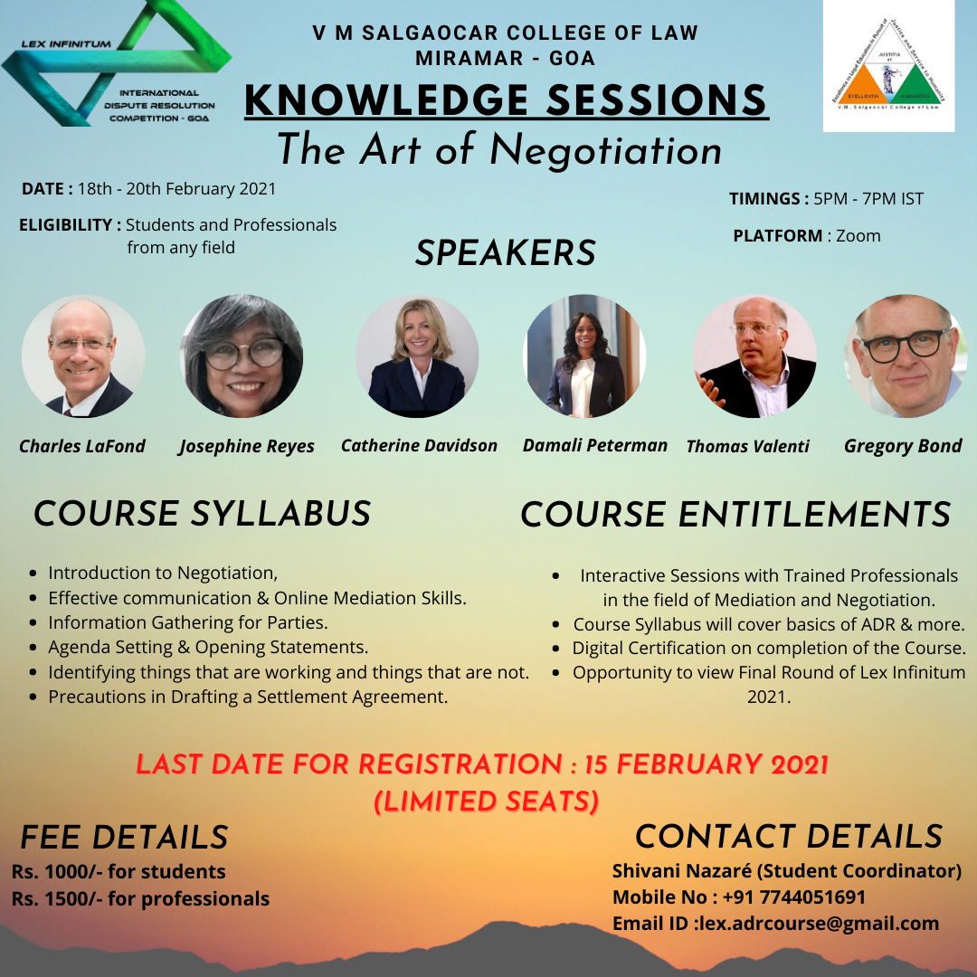 Knowledge Sessions are training sessions that are conducted for students as well as professionals from all fields. The three-day online course comprising 6 sessions will be held from 18th to 20th February 2021 (17:00 – 19:00 IST) on the Online Platform Zoom. The course provides the opportunity to learn the essential skills and values to become an effective negotiator and a skilled mediator. Experienced and highly qualified International ADR experts will delve into the theoretical aspects of negotiation and mediation as well as provide a hands-on practical experience with role-play simulations.