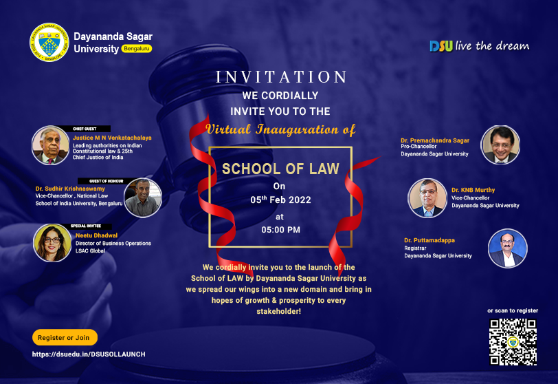 We cordially invite you to attend the virtual launch of the School of Law by Dayanand Sagar University as we spread our wings into a new domain and bring in hopes of growth & prosperity to every stakeholder.