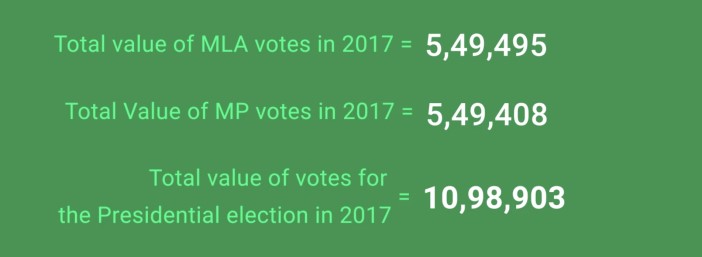Both the values (MP & MLA) are added to the total value of the votes for any Presidential Election. In 2017, this value was 10,98,903 (5,49,408 for MP & 5,49,495 for MLA). The total number of eligible voters in the 2017 election is 4896 (776 MPs & 4120 MLAs from states).