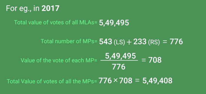 The total value of votes of all the States is divided by the total number of elected members of Parliament (Lok Sabha 543+Rajya Sabha 233) to get the value of votes of each Member of Parliament or the MP. For 2017, this worked out to be 708. The value of an MP vote is substantially higher than the value of an MLA vote. It is in fact 3.5 times the value of an MLA’s vote in Uttar Pradesh where the value of an MLA vote is the highest.