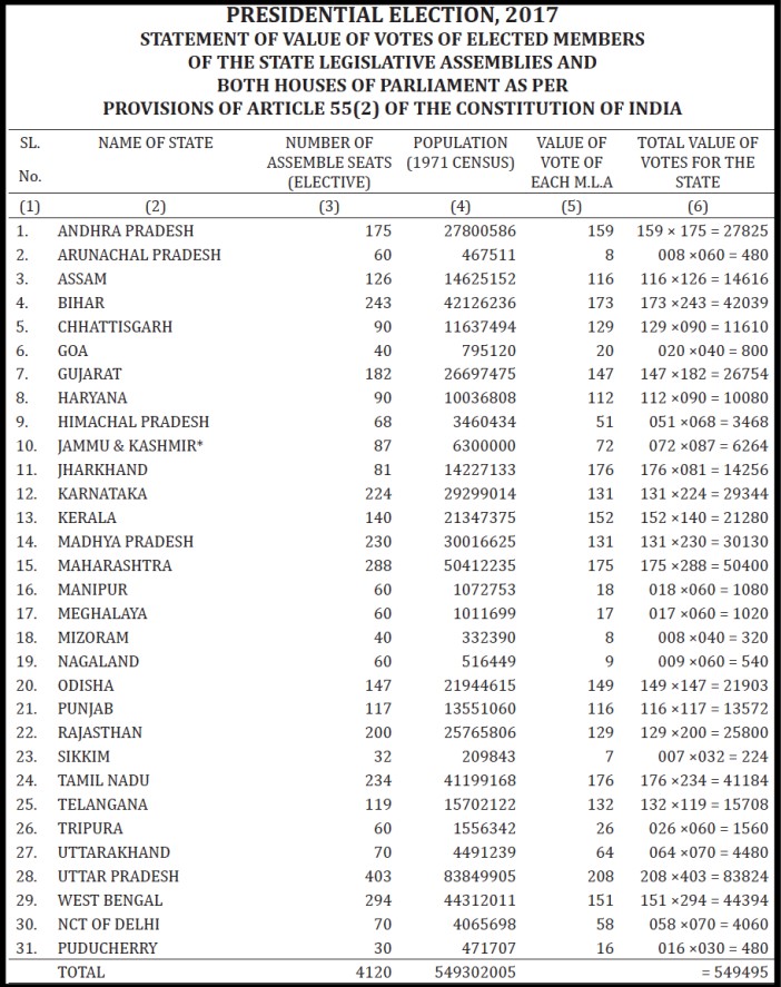 The value of the vote of each MLA is calculated by dividing the population of the State as per the 1971 Census, by the total number of elected members of the respective state assembly, and then dividing the quotient by 1000. The total Value of all members of each State Assembly is obtained by multiplying the number of seats in the Assembly by the number of votes for each member. A similar process is followed for all the states. For the 2017 Presidential election, the total value of the MLA votes is 5,49,495.
