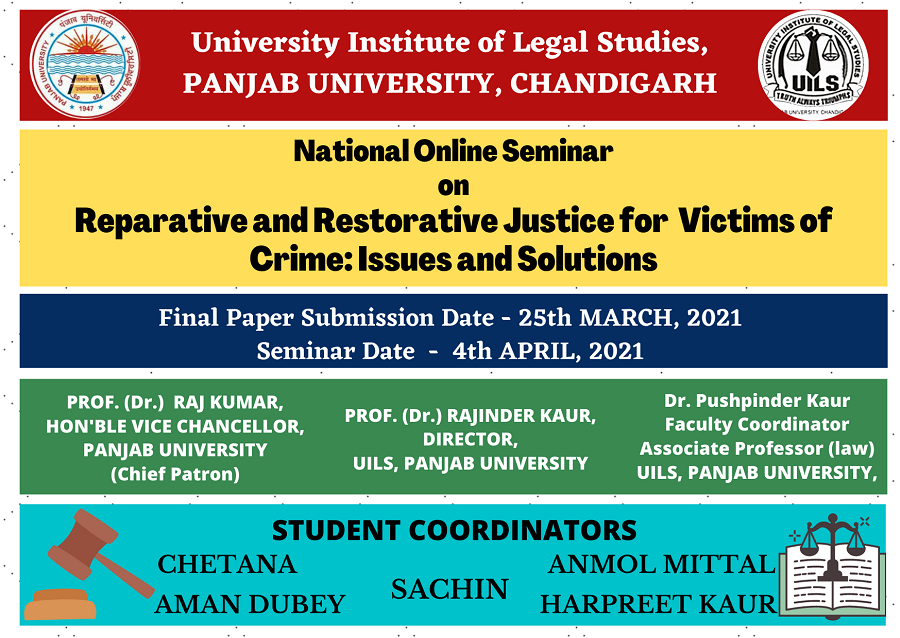 To ponder over the limitations and deficiencies of the existing legal, social, political, and economic arrangements and to find the way forward, the University Institute of Legal Studies, Panjab University, Chandigarh has planned to organise one day National Seminar on Reparative and Restorative Justice for Victims of Crime: Issues and Solutions on 4th April 2021.