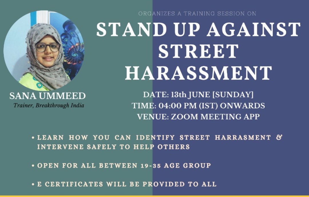 Break Through Trust in Collaboration with Hoot Welfare Society organizes a Training Program on Stand Up Against Street Harassment on 13th June 2021.
