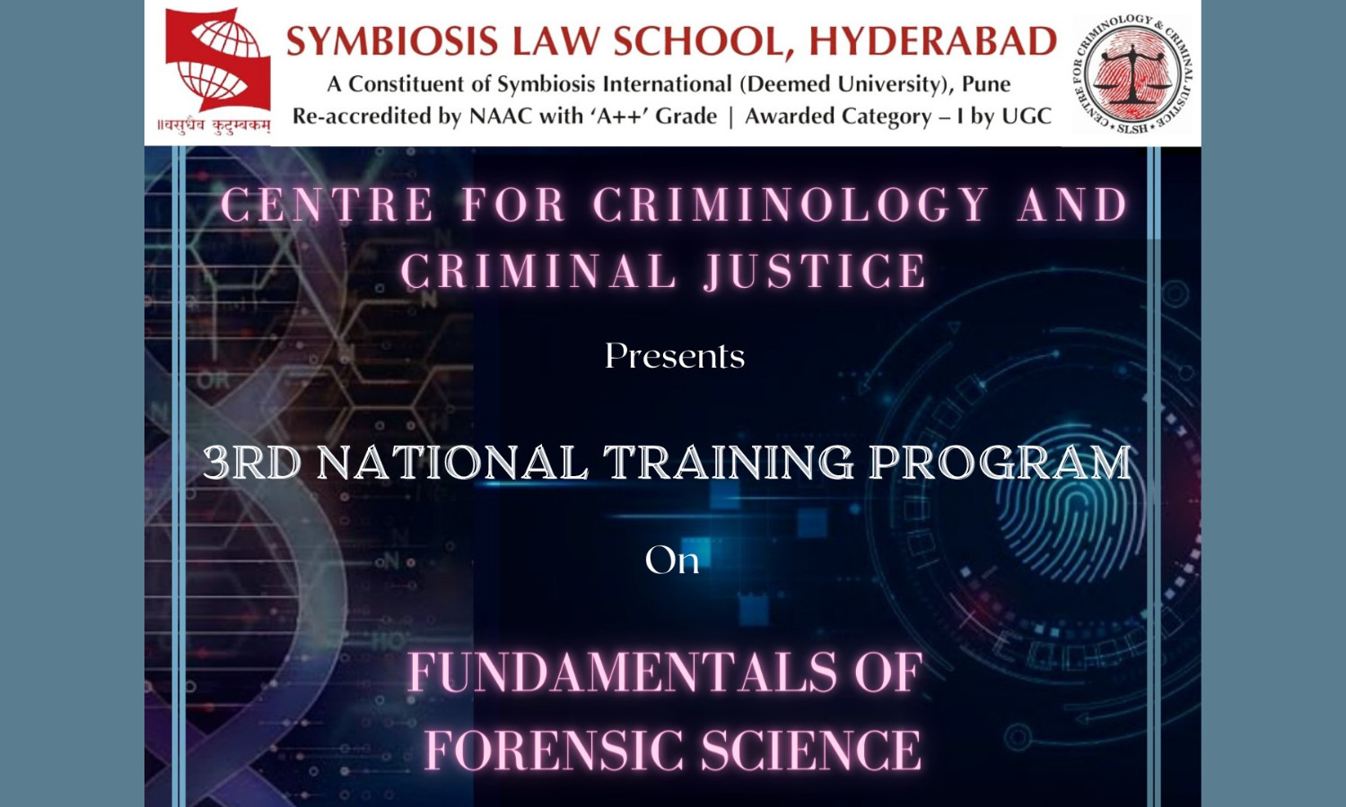 Registrations for 3rd National Training Program on Fundamentals of Forensic Science are being invited by Centre for Criminology and Criminal Justice (CCCJ) of Symbiosis Law School, Hyderabad by 20th April, 2023. The National Training Program on Fundamentals of Forensic Science is the flagship event conducted by Centre for Criminology and Criminal Justice (CCCJ) of Symbiosis Law School, Hyderabad. The third edition of the event will be conducted on 28th and 29th April, 2023.