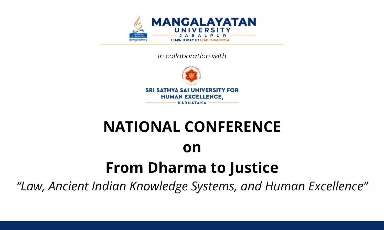 Faculty of Law, Mangalayatan University, Jabalpur is organizing a National Conference (Hybrid Mode) organized in collaboration with Sri Sathya Sai University for Human Excellence, Karnataka on “From Dharma to Justice: Law, Ancient Indian Knowledge Systems and Human Excellence.