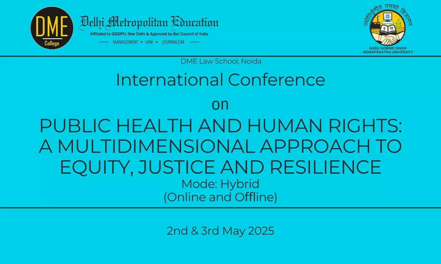 DME Law School Noida is organizing a two-day International Conference on "Public Health And Human Rights: A Multidimensional Approach To Equity, Justice And Resilience", scheduled to be held on 2nd-3rd, May 2025 in hybrid mode.
