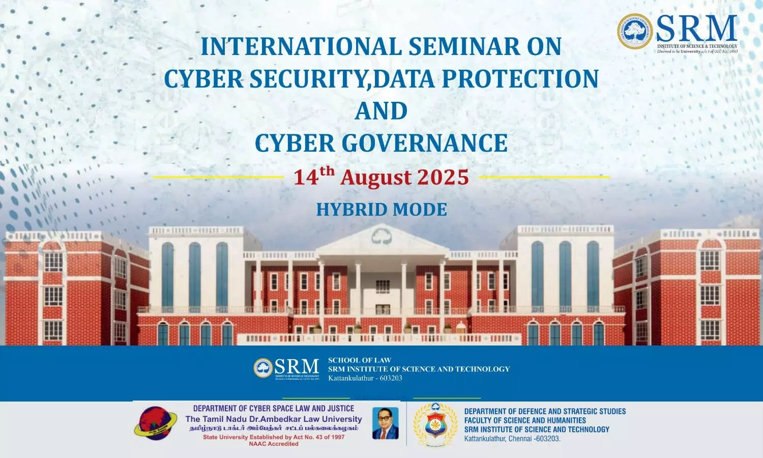 School of Law, SRMIST, in collaboration with The Tamil Nadu Dr. Ambedkar Law University, is organising an International Seminar on Cyber Security, Data Protection, and Cyber Governance, scheduled to be held on 14 August 2025.