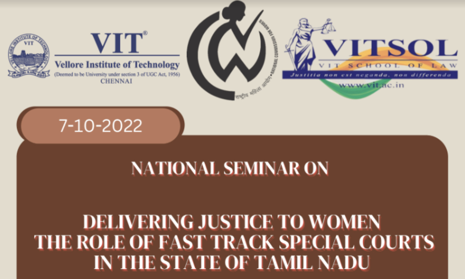 VIT School of Law in association with National Commission for Women New Delhi is organising a National Seminar on Delivering Justice to Women - "The Role of Fast track special courts in the state of Tamil Nadu" on 7th October, 2022 and seeking submissions for the same. The last date for registration is extended to 3rd October(Monday), 2022.