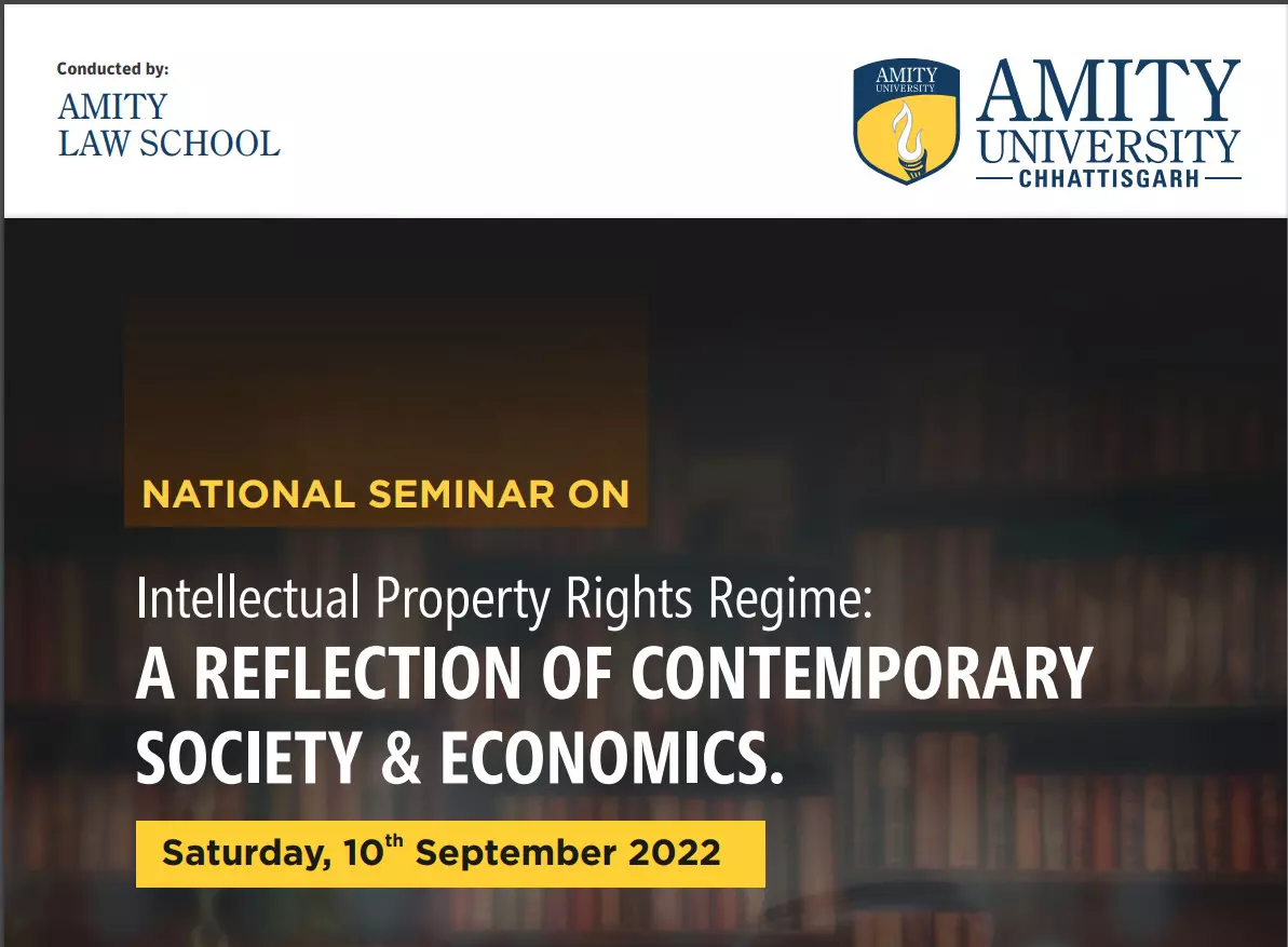 Amity Law School Chattisgarh is organising National Seminar on Intellectual Property Rights Regime: A Reflection Of Contemporary Society & Economics on Saturday, 10th September 2022.