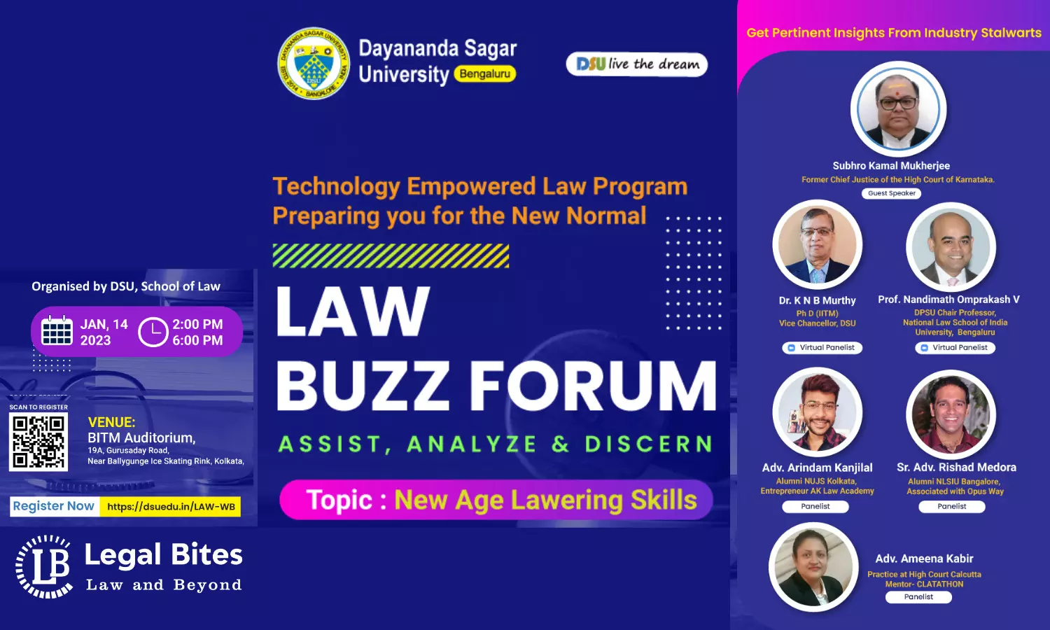 Dayananda Sagar University hosting Law Buzz Forum on “New Age Lawyering Skills” from 2:00 p.m. to 6:00 p.m. on 14th Jan at Kolkata.