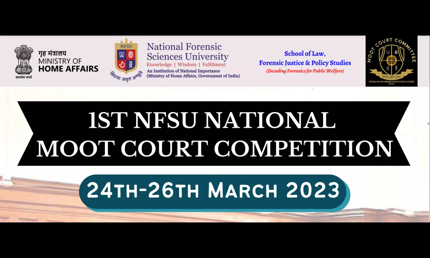 It is a privilege and pride to announce that SLFJPS, NFSU is organizing the 1st National Moot Court Competition 2023 from 24-26th March 2023 at National Forensic Sciences University, Gandhinagar Campus, Gujarat in Physical Mode.