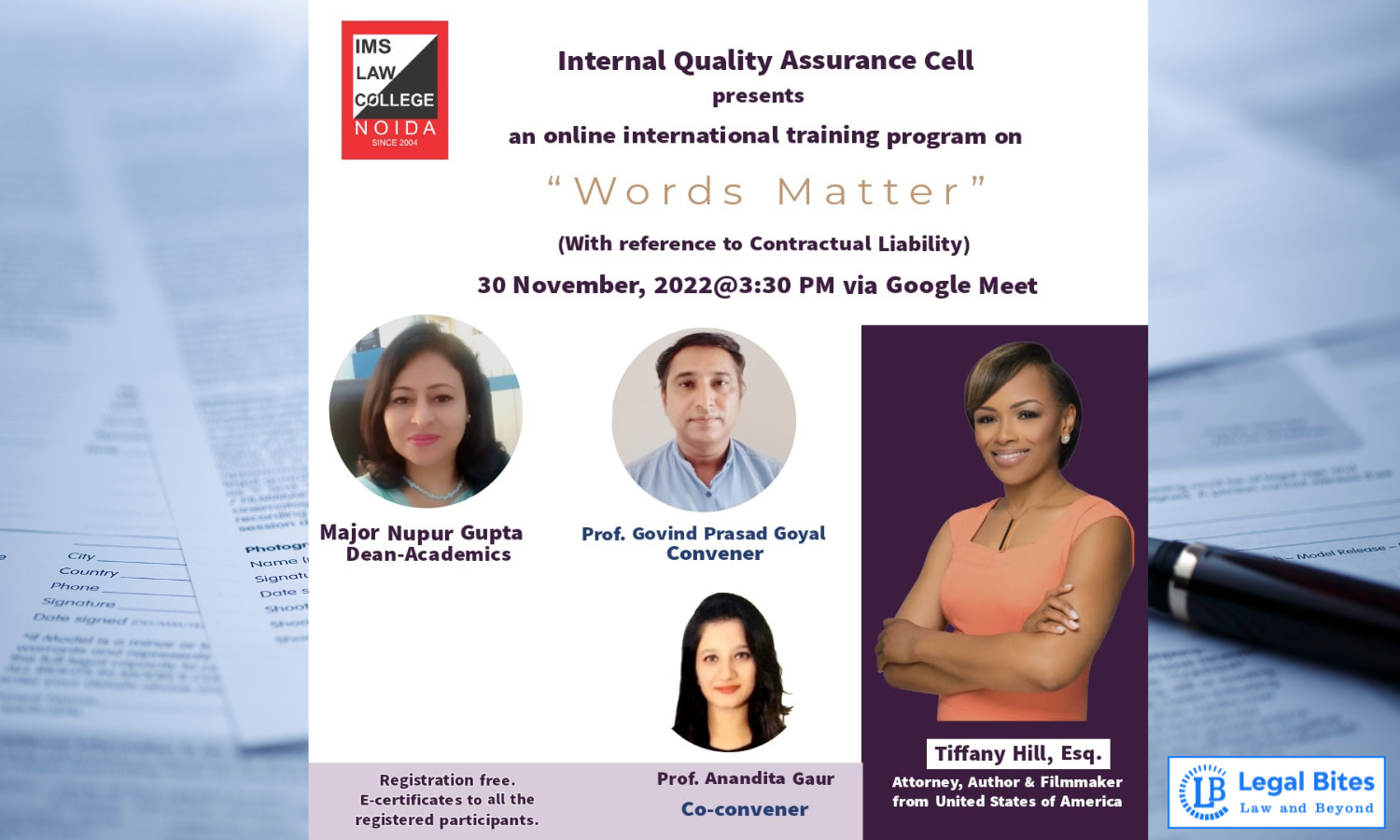 IMS Law College, Noida is organising an International training programme on “Words Matter” with reference to Contractual Liability on November 30, 2022 at 3:30 PM via Google Meet.