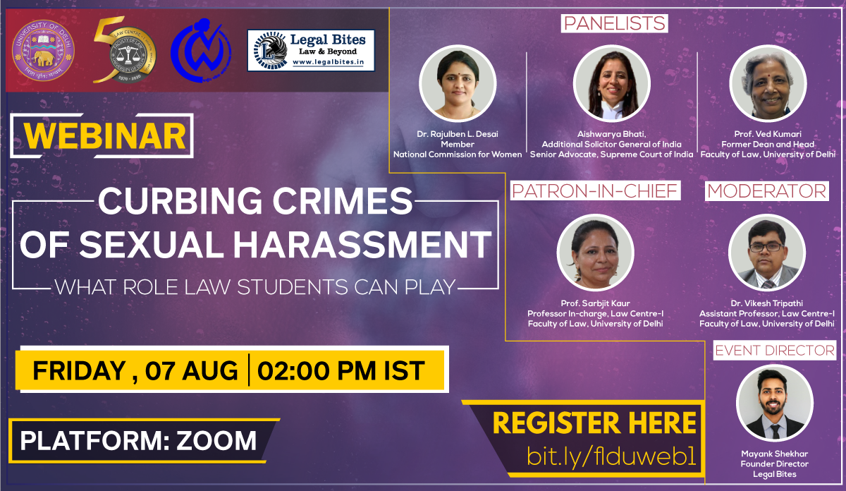 Webinar on Curbing Crimes of Sexual Harassment What Role Law Students Can Play is being organised by Law Centre-I, Faculty of Law, University of Delhi in collaboration with National Commission for Women and Legal Bites.