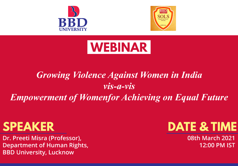 School of Legal Studies is organising a Webinar on “Growing Violence Against Women in India vis-a-vis Empowerment of Women for Achieving on Equal Future” on the occasion of International Women’s Day on March 08, 2021 (Monday), at 1200 Hrs (IST).