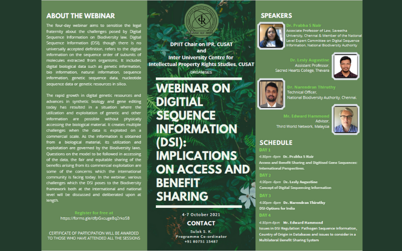 Webinar on digital sequence information(DSI): Implications on access and benefit-sharing will be organized by IPR Studies, Cochin University of Science and Technology.
