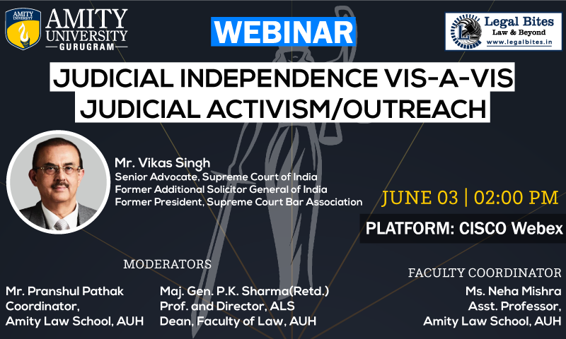 Webinar on Judicial Independence vis-a-vis Judicial Activism is being organised by Amity Law School Gurugram. The speaker for the webinar is Mr. Vikas Singh, Senior Advocate, Supreme Court of India, Former Additional Solicitor General of India and Former President, Supreme Court Bar Association.