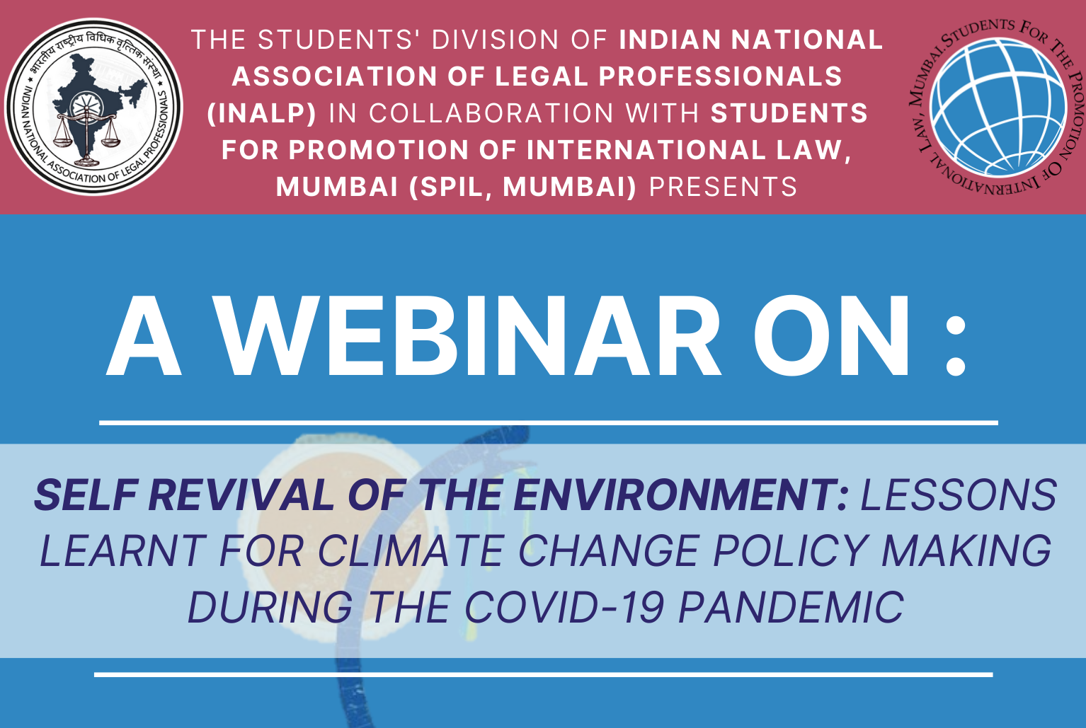 Webinar on Self Revival of the Environment: Lessons learnt for climate change policymaking during the COVID-19 Pandemic SPIL, Government Law College, Mumbai in collaboration with Indian National Association of Legal Professionals (INALP), are pleased to announce Webinar on “Self Revival of the Environment: Lessons learnt for climate change policymaking during the COVID-19 Pandemic”. About the Webinar The Climate Crisis is not on hold, so Climate Action cannot be on hold...