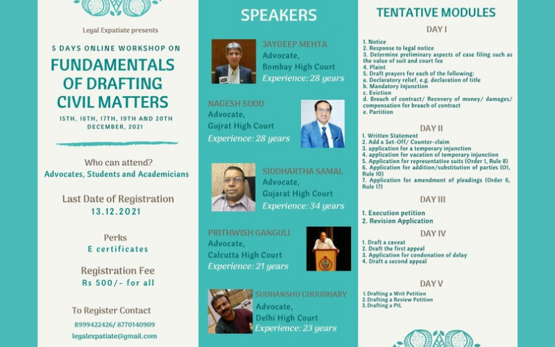 Legal Expatiate is organising a 5 Days Online Workshop on Fundamentals of Drafting Civil Matters from 15th – 20th December 2021.